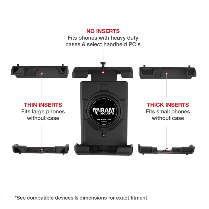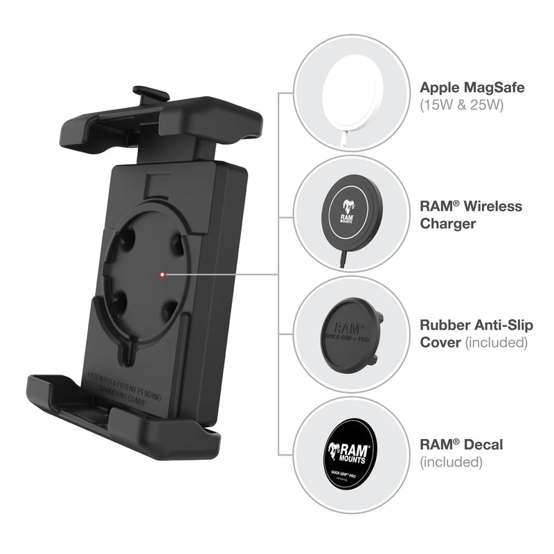 ( Chat Live to get an ETA ) $106.99 The RAM® Quick-Grip™ Pro XL Phone Holder with Ball & Vibration Damper (RAM-HOL-PD7BVU) is the next evolution of the RAM® Quick-Grip™ series, re-designed to be the most rugged universal phone holder that fits a wide range of phones and handheld devices with an integrated vibration damper. This phone holder features an integrated cavity for an Apple MagSafe puck, allowing you to turn the phone holder into a wireless charging solution. Not interested in charging? No problem! The included anti-slip cover ensures a flush fit when the Apple MagSafe puck is not installed. The RAM® Quick-Grip™ Pro XL features a spring-loaded design that allows easy one-handed insertion and removal of your device. Large and small shims are included to provide a snug, secure fit for large and small phones without a case. Complete the solution by building your mount—this holder is RAM® Compatible™ and includes a B size pin-lock ball. RAM® recommends installing the provided device tether when this holder is used in a vehicle with an open cockpit. It is important to verify the dimensions of your handheld device with its case, sleeve, or skin when determining the overall size. Spring-loaded holder with integrated vibration damper provides a secure hold for phones and handheld devices; easily insert and remove your phone with one hand Center cavity compatible with Apple MagSafe puck; non-slip cover and puck adhesive included Comes with optional device tether for open cockpit environments Made of high-strength composite for durability and reliability in the most demanding environments Backed by a lifetime warranty hardware included: holder dimensions: ball size: weight capacity: materials: packaging type: Additional Information: